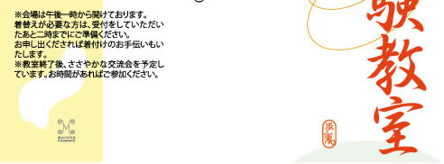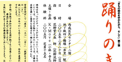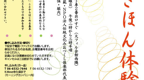 | ●申し込み方法・締切り 下記まで電話・ファックスでお願いします。 参加される方のお名前、お電話番号をお知らせください。 定員になり次第締め切らせていただきます。 キャンセルは三日前までにお願いします。 申し込み先(月〜金) T 06-6532-7646 F 06-6532-1761 K-Move寺久保まで (モーニングカンパニー内)※会場は午後一時から開けております。 着替えが必要な方は、受付をしていただいたあと二時までにご準備ください。 お申し出くだされば着付けのお手伝いもいたします。 ※教室終了後、ささやかな交流会を予定しています。お時間があればご参加ください。 furaku |
