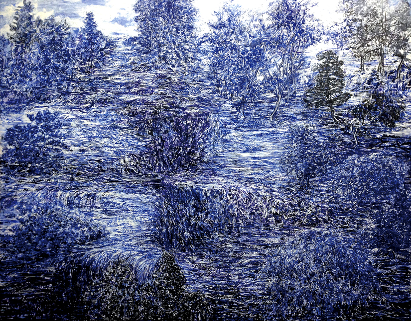 By mainly using the color blue that is derived from water and overlapping different colored tones and lines, my objective is to convey something much like the elegance in landscapes.