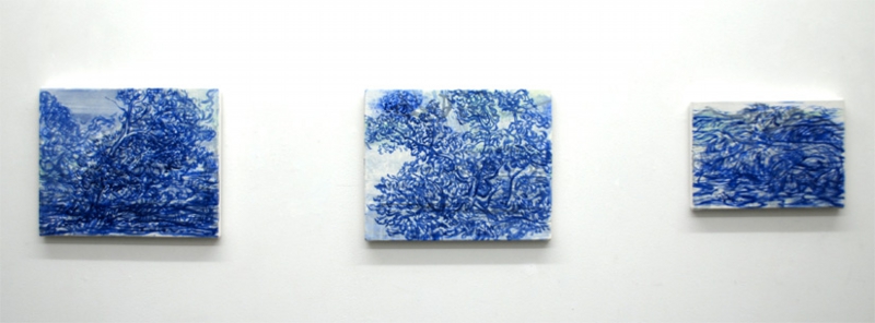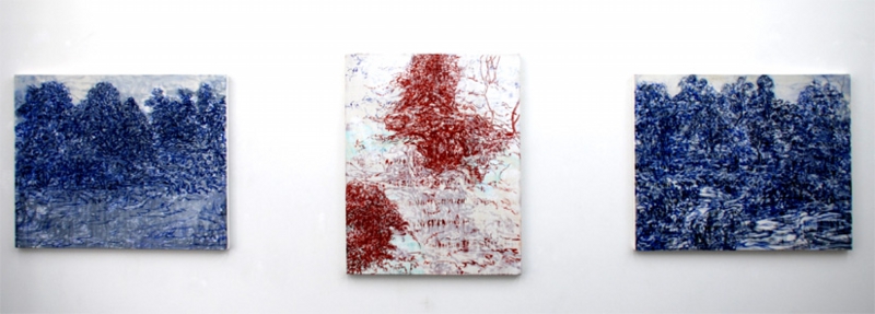 In the exhibition “Working aqua 2015”, the landscape paintings contain a sense of movement through the composition and layering of trees researched at different areas and flowing water.