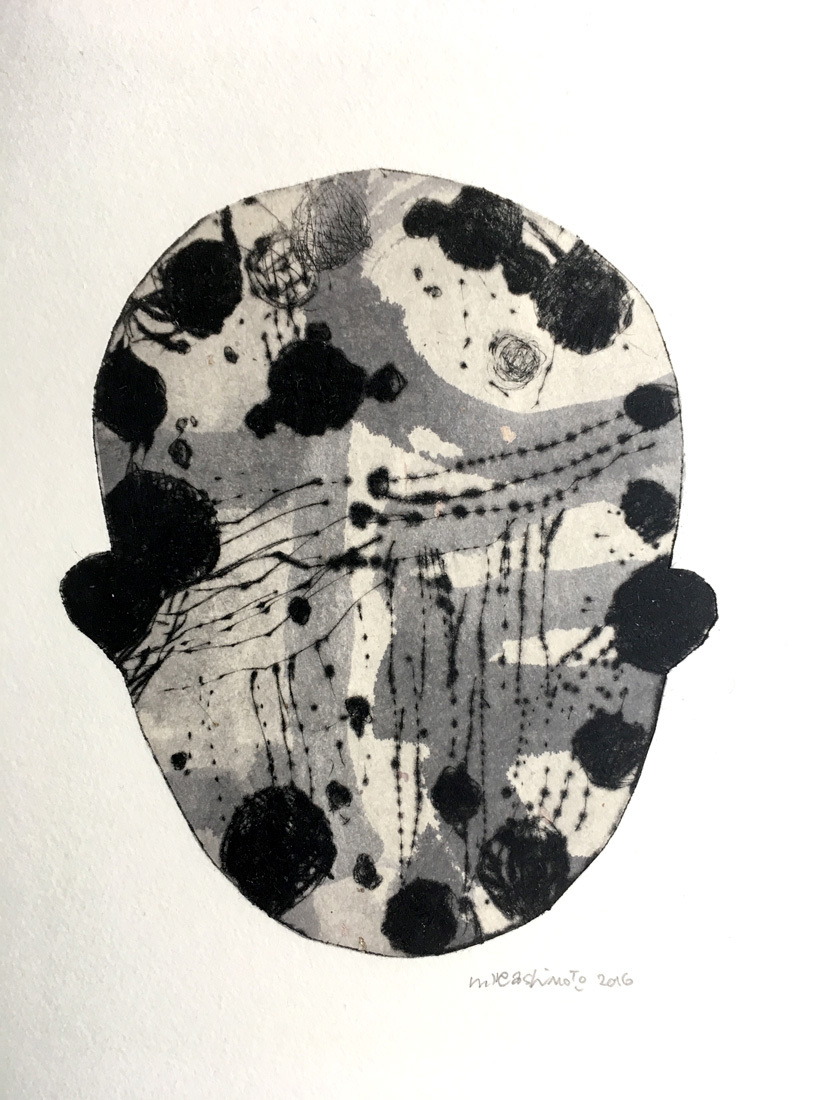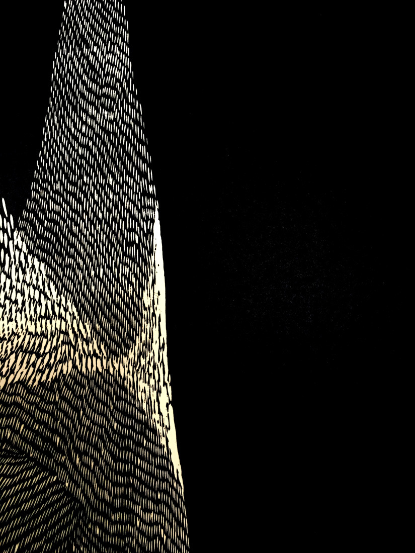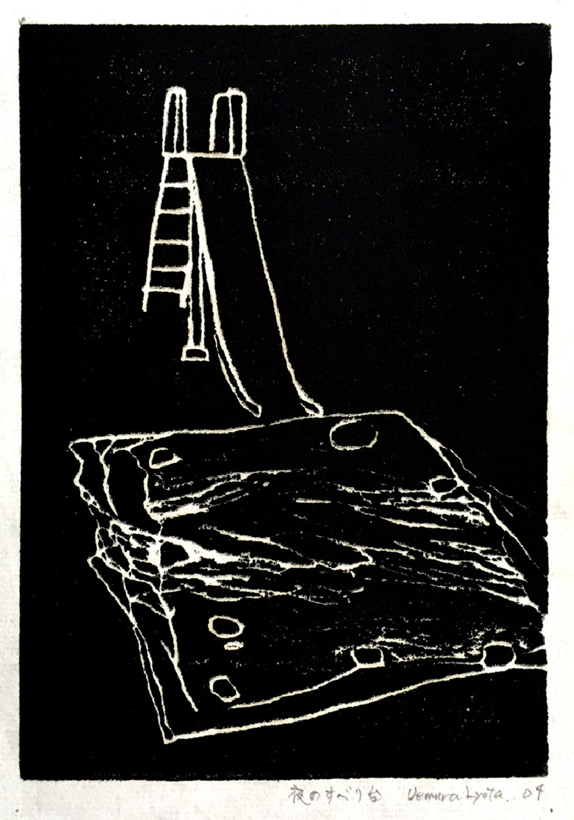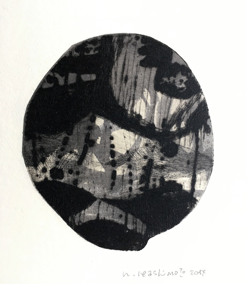 私にとって版木と対峙している時間は、真夜中のようなものです。じっと見つめていると、記憶や、感情や、自分の輪郭までもがぼやけて溶け出してゆくような感覚が、そこにはあります。 その中を彷徨うように、戯れるように手を動かすことで生まれてくるリズムや流れ、その重なりによる曖昧なイメージの痕跡を紙にインクで刷りとります。 刷り上がったとき、私は今まで見ていた世界の向こう側に立っているような、そんな気さえするのです。