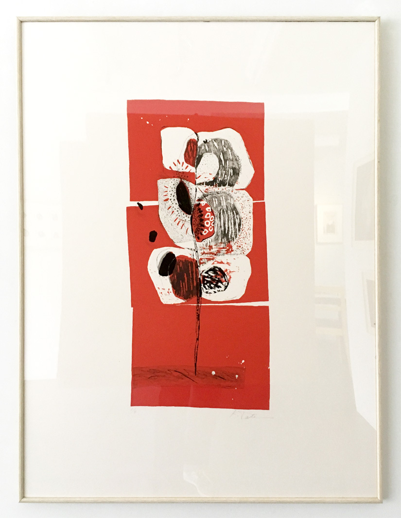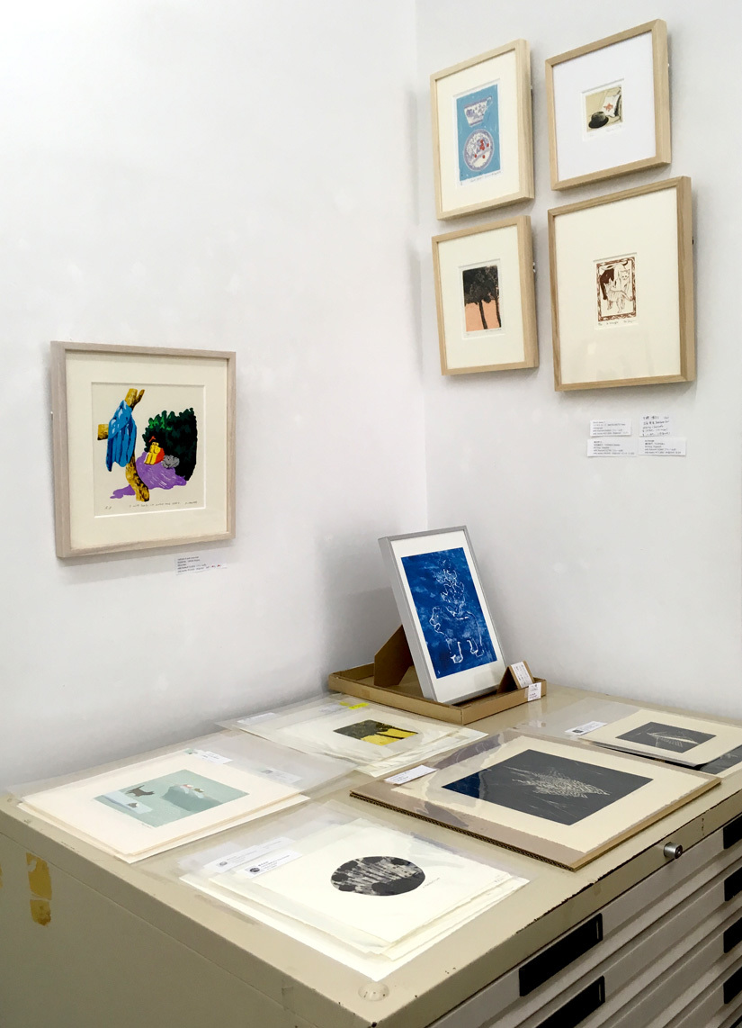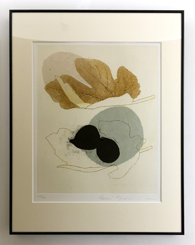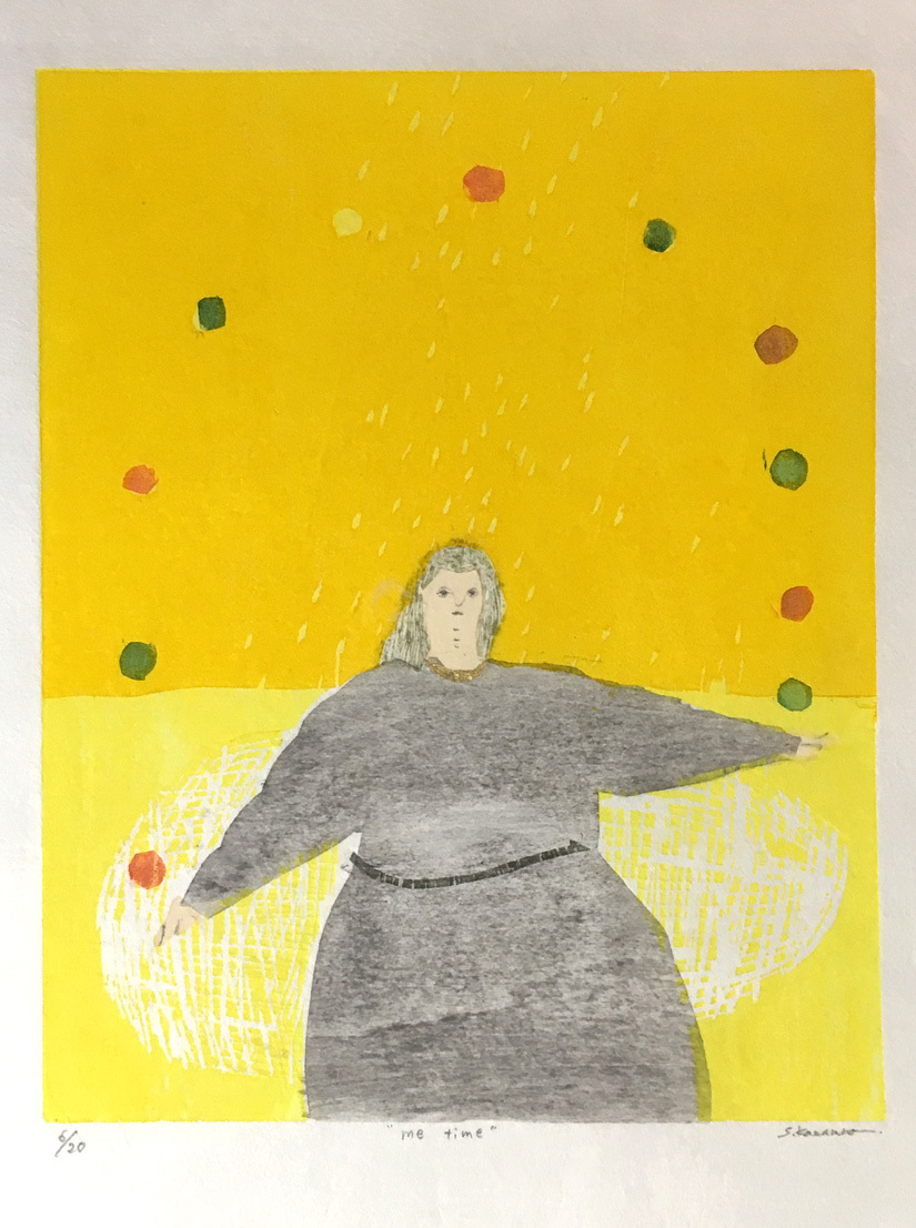 私はタブローの作家として主に作品発表をしています。制作に向き合う上で絵画と版画で気持ちに違いはありませんが、版画は1年の内に3ヶ月間だけと決めています。私は版を重ねる行為を時間の経過と捉えています。1版重ねるごとに時間のズレが生じ、そこに自然に新たなイメージが生まれ、加えられて行きます。軽やかでごく自然に、、、だからこそ短時間に集中したい。私の作品のコンセプトは”命の温もり”です。それは人間や植物の発芽や胞子のイメージと重なります。タイトル”花と実”の作品も花でありながら同時に実もなる、なんとも捉えがたい花に仕上がりました。